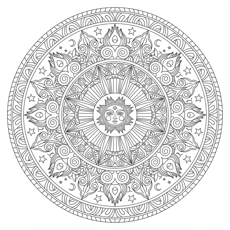 Descubra esta bela mandala sol para colorir. Um design único inspirado no tema sol, perfeito para reduzir o estresse e estimular a criatividade.