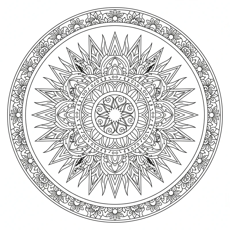 Descubra esta bela mandala sol para colorir. Um design único inspirado no tema sol, perfeito para reduzir o estresse e estimular a criatividade.
