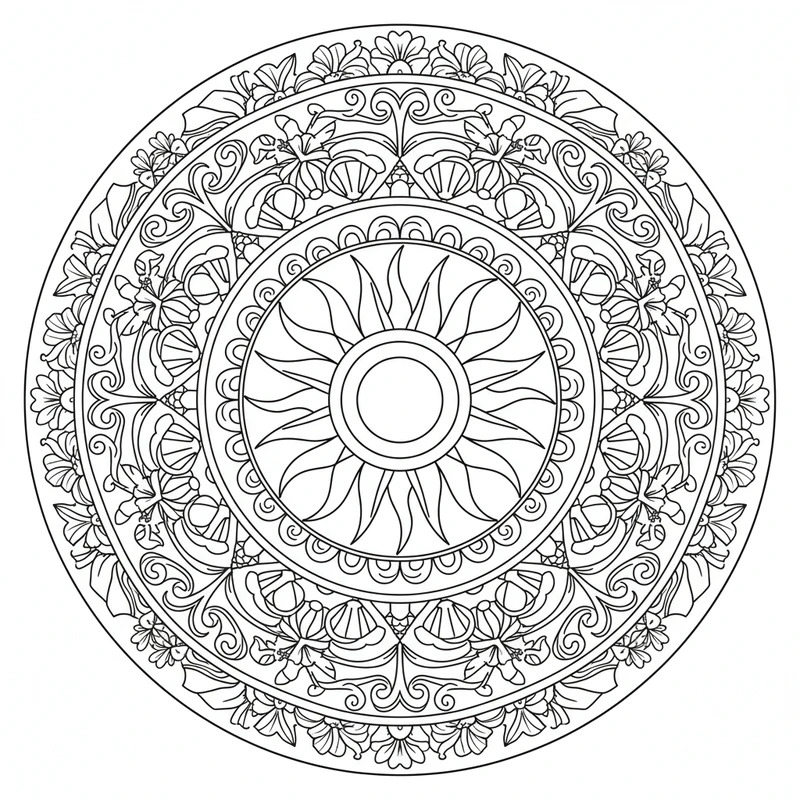 Descubra esta bela mandala verão para colorir. Um design único inspirado no tema verão, perfeito para reduzir o estresse e estimular a criatividade.